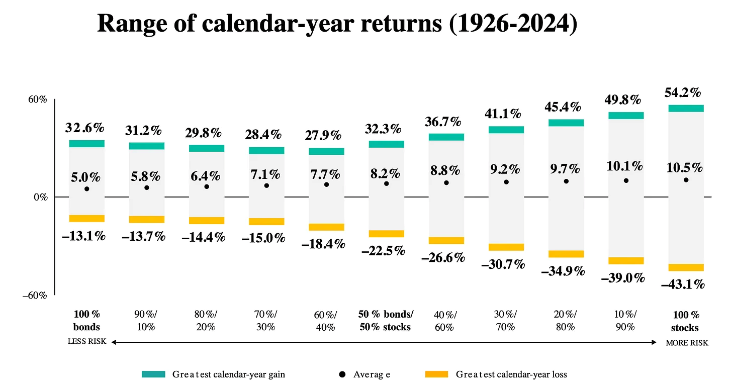 What do you see? That in the long run, your average return from holding only stocks isn’t much different than holding a balanced portfolio…and the ride is much smoother.